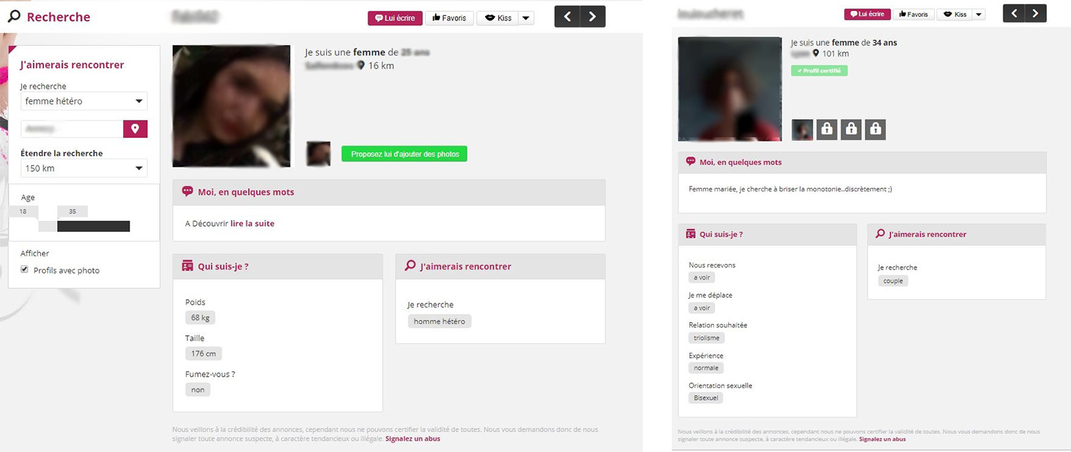 Côté design, c’est plutôt classique, agréable, mais sans fioritures. On trouve rapidement ce qu’on cherche. Dans le moteur de recherche, les profils sont présentés comme des cartes, avec la photo principale et les informations essentielles : pseudo, âge, lieu. Comme ça, on peut trouver vite fait des contacts qui peuvent répondre à nos attentes.
