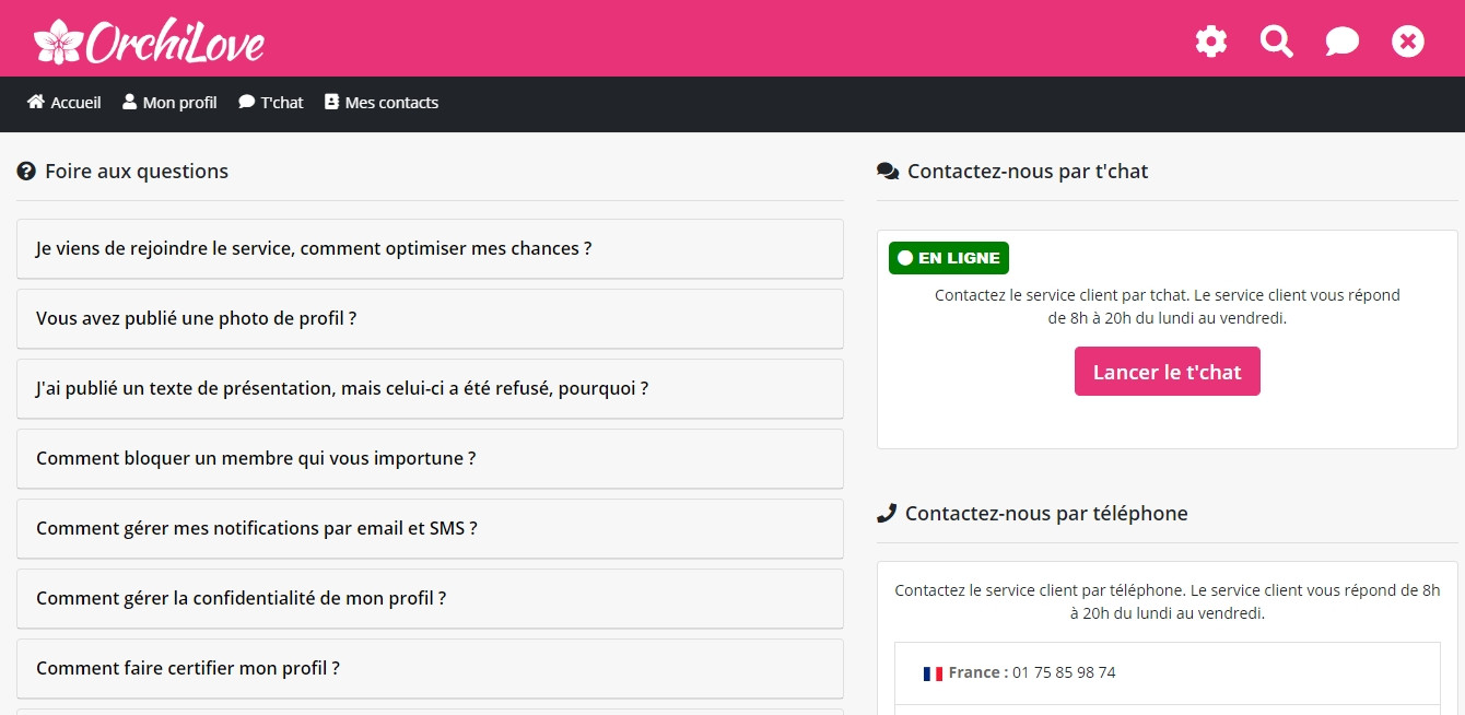 Le support client d’Orchilove est plutôt complet puisque le site de rencontre est équipé d’une Foire aux Questions qui répond aux questions les plus courantes. On peut aussi contacter directement le service client par tchat de 8h à 20h du lundi au vendredi ainsi que par téléphone ou message directement depuis le site.