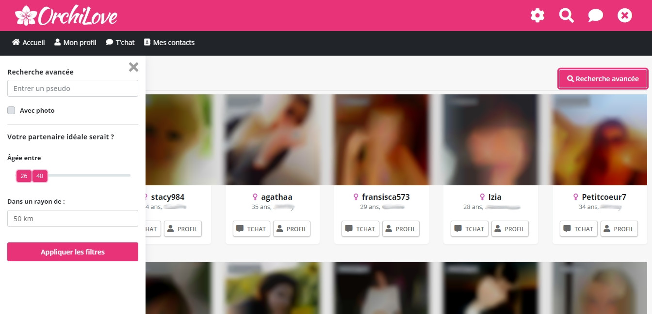 Pour augmenter nos chances de trouver un/une partenaire, Orchilove intègre, comme tous les sites de rencontre, un moteur de recherche avec des filtres. La recherche avancée nous permet de filtrer avec une fourchette d’âge et un rayon géographique. On peut aussi filtrer les profils avec photo. Ce moteur de recherche est simple à utiliser et donne d’assez bons résultats même si les filtres sont peu nombreux.